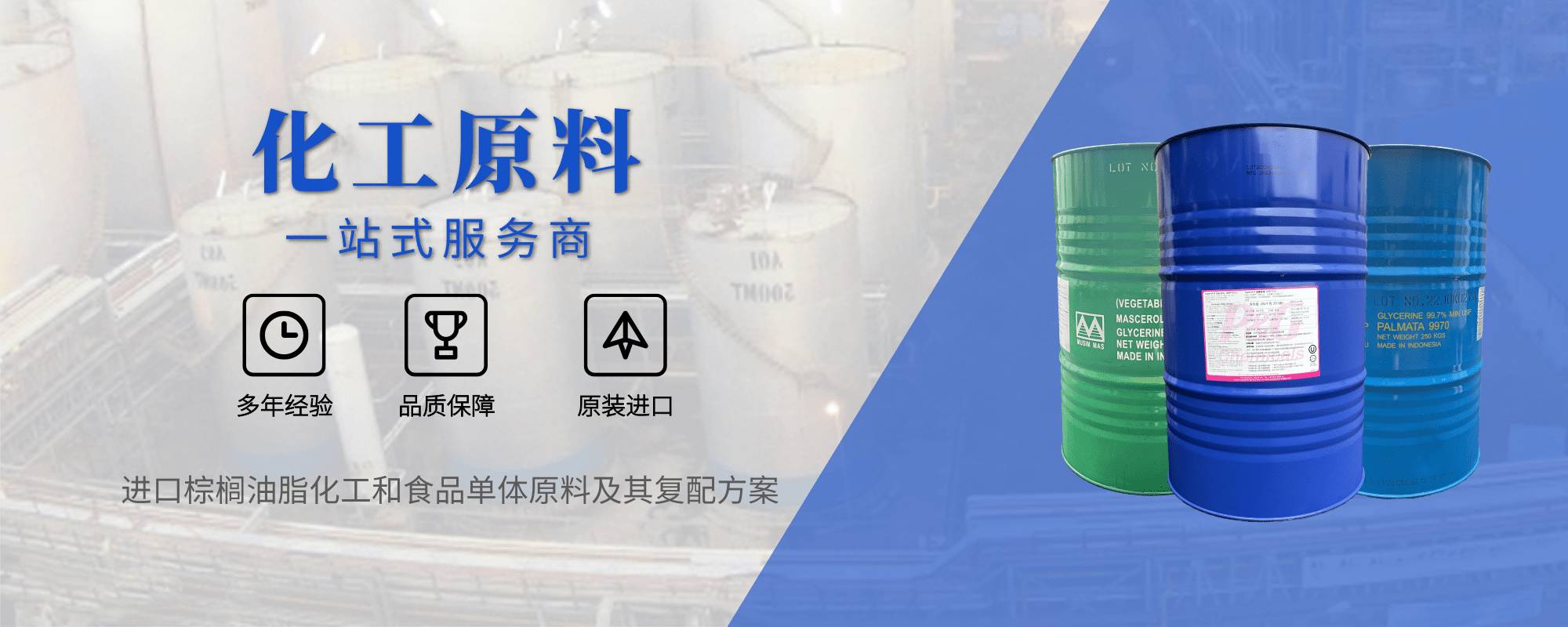 主营:甘油,丙二醇,十六醇,十八醇,十六十八醇,月桂酸,肉豆蔻酸,棕榈酸,硬脂酸,椰蓉,MCT,GTCC,精炼椰子油,冷压初榨椰子油