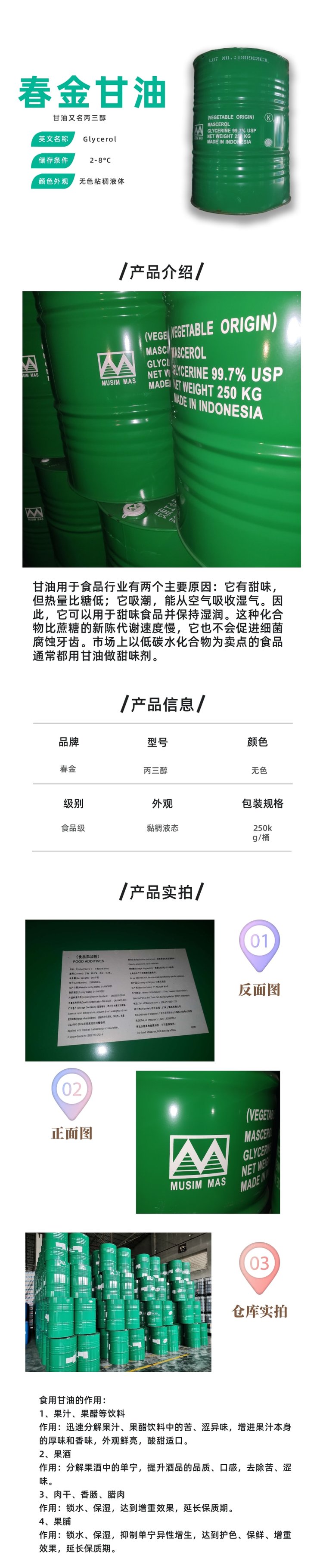食品级甘油 印尼进口 原装铁桶 春金品牌 供应丙三醇